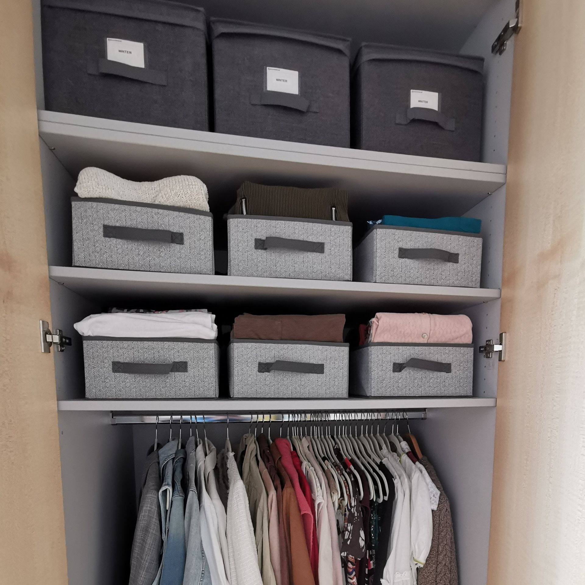 - Sortieren nach Kategorien und Verwendung von Boxen/ einheitlichen Kleiderbügeln